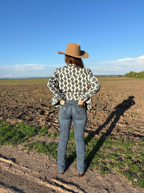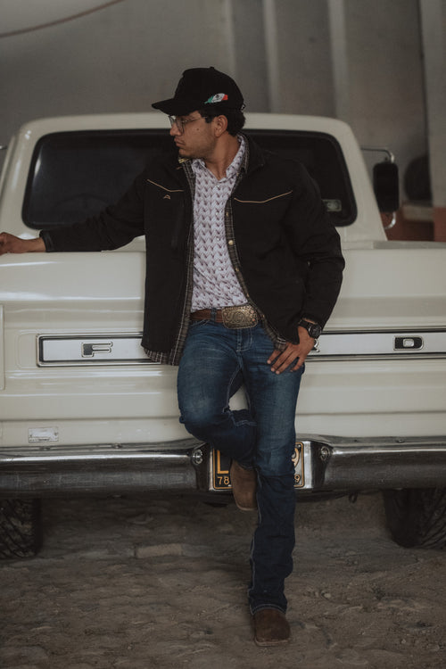 - Corte regular con manga larga, botones tipo snap en pecho y puño fáciles de abrochar.